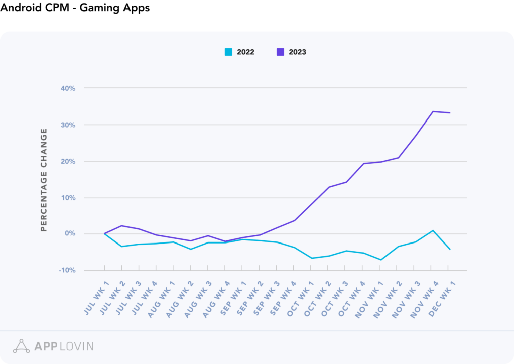 From the summer months extending into the crucial end-of-year period, there is a greater increase in performance compared to last year. For example, Android rates during the Thanksgiving holiday last year were in line with CPMs at the beginning of July. However, this year has shown significant growth, with CPMs rising by 33%1 – even outpacing results in 2021.