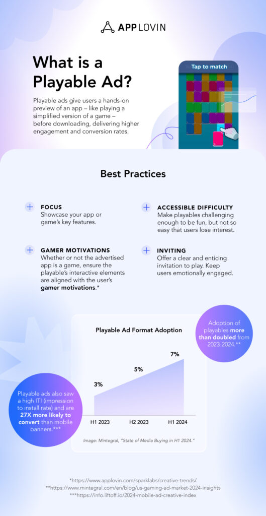 Playables have proven to be effective at increasing conversions: A recent study shows that they’re more than 20X more likely to result in conversion than a mobile banner. They’re so successful that their adoption more than doubled between 2023 and 2024, extending beyond gaming apps into verticals including retail and finance. How well do they work? According to a recent study on playables: