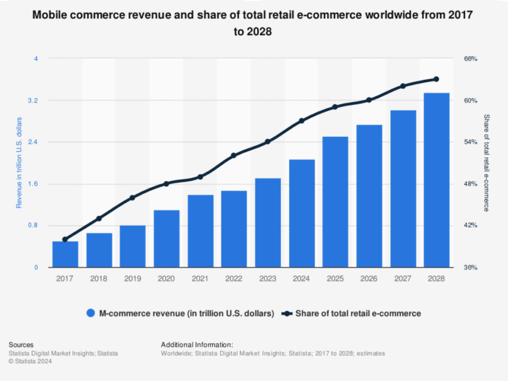 Retail apps in particular are becoming more popular as consumers prove that they’re more comfortable than ever ordering products online. With every passing year, mobile commerce makes up a larger share of e-commerce. By 2028, it will comprise a full 60% of all e-commerce revenue.