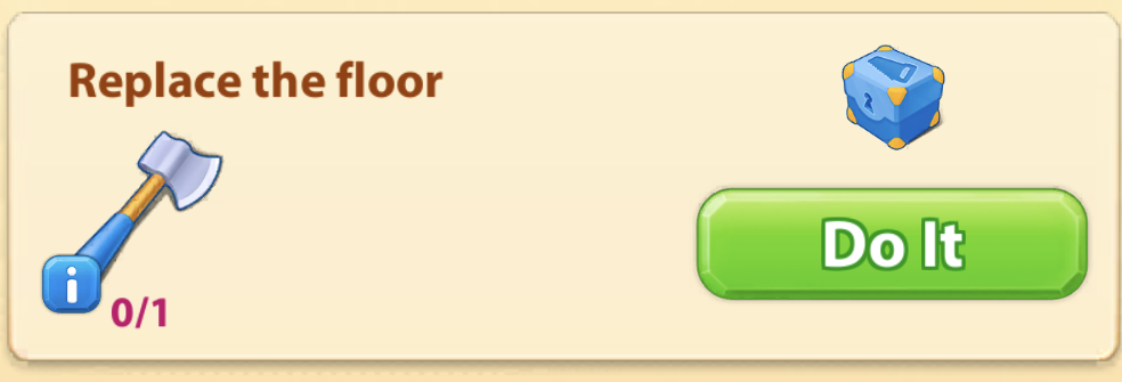 『マージ・ヴィラ』はタスクをクリアしていくことでゲームを進めることができます。タスクには異なるレベルで様々なアイテムが必要になります。例えば床を張り替えるために必要なのはこちらのアイテム。これには道具箱から出てくるアイテムをマージさせて作る斧が必要になります。