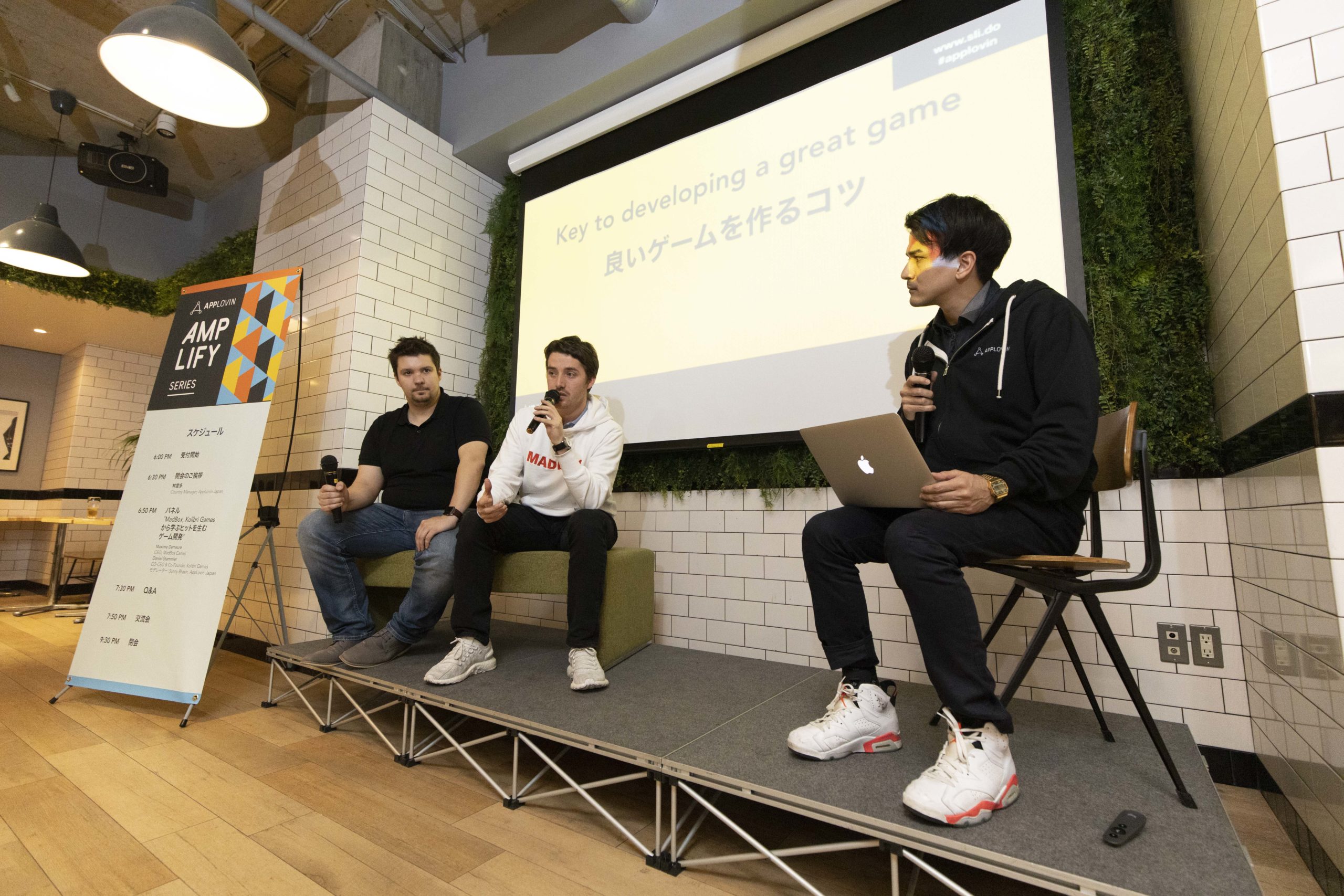 そして今回のメインイベント、Madbox の Maxime Demeure 氏および Kolibri Games の Daniel Stammler 氏が登壇するパネルディスカッション。モデレーターは、AppLovin のサニーがつとめました。