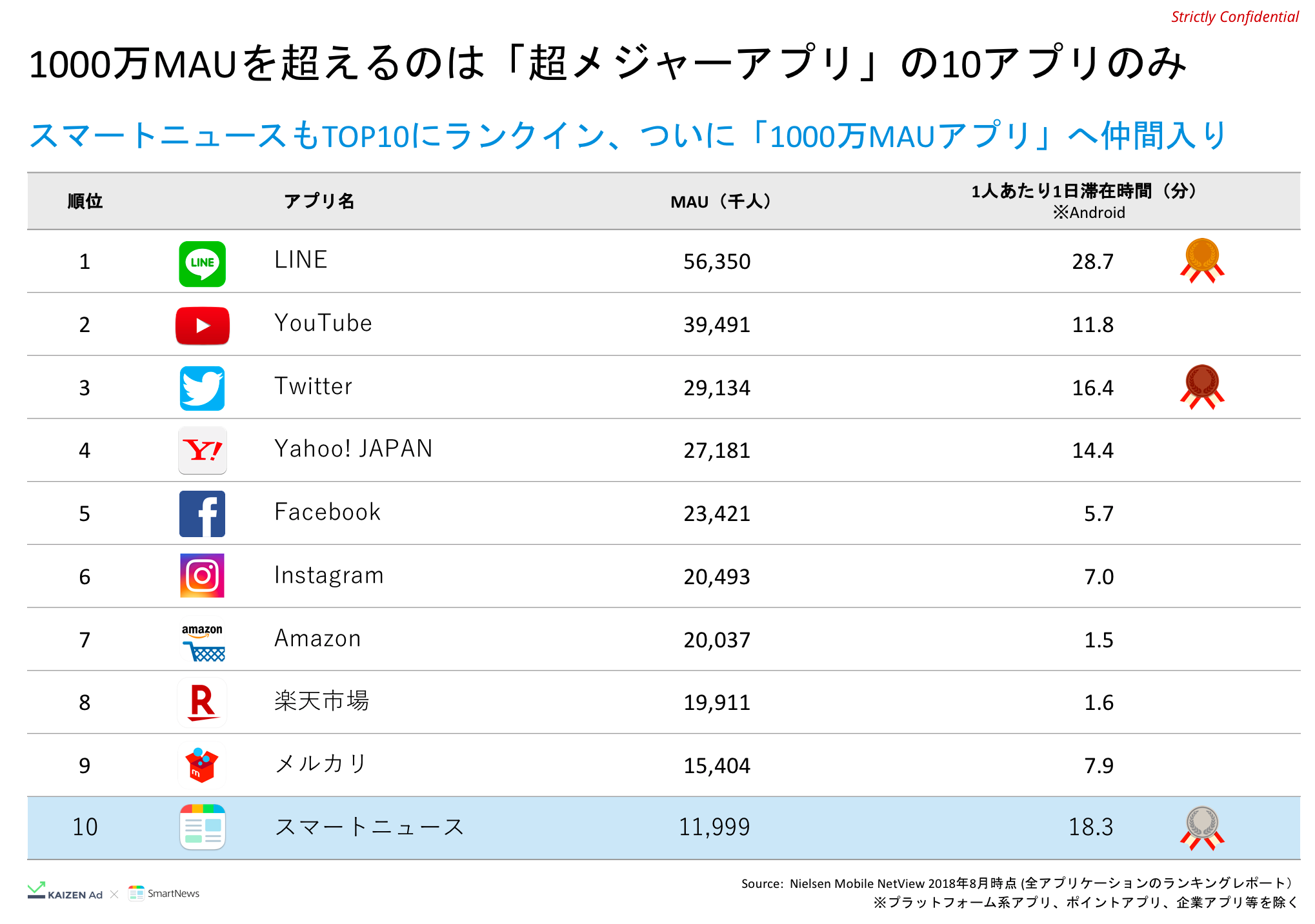 川崎:スマートニュースの広告事業の責任者をさせていただいています、川崎と申します。よろしくお願いします。ではまず、スマートニュースについてご紹介させてください。お陰様でスマートニュースを使っていただいているが方多いですが、実際皆様が思っているよりも多くの方にご利用いただいています。視聴率調査会社のニールセンさんが発表したアプリ の MAU ランキングで、スマートニュースは日本で10位です。