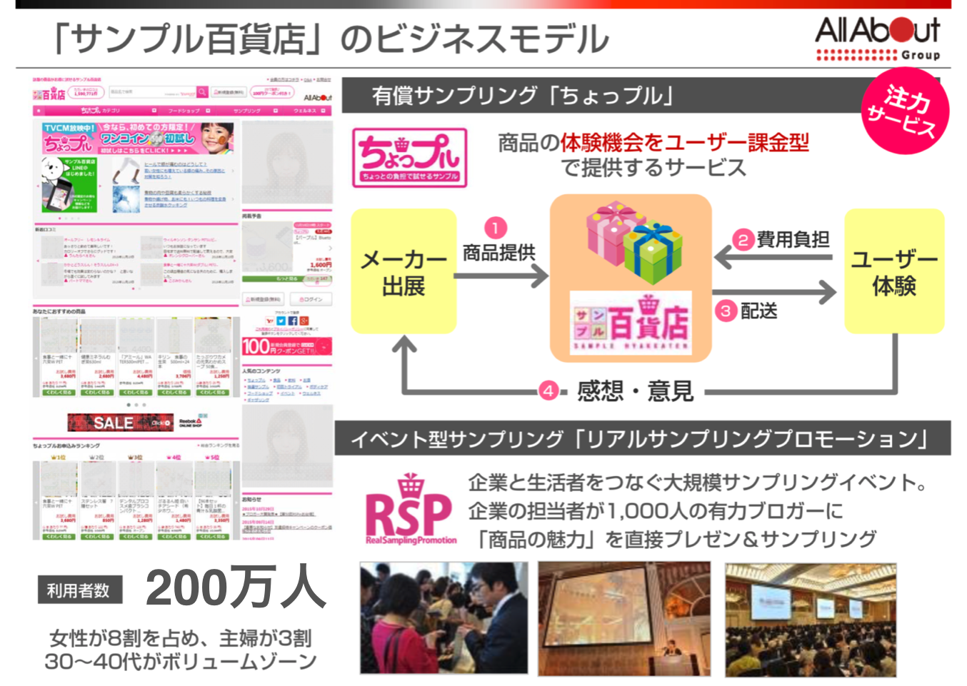 サンプル百貨店は、現在200万人もの利用者がいるサービスです。利用者の80%は、30~40代の女性で、主婦の方などにかなり知名度があります。是非、女性向けマーケティングの際のヒントになればと思います。
