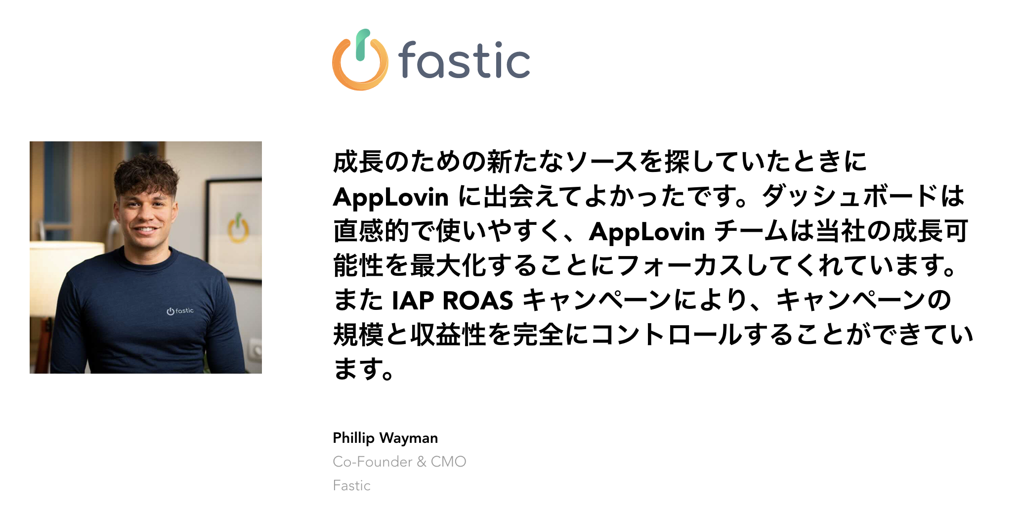 Fasticの成長ストーリーは、直近のAdweek(英語記事)でも詳しくお読み頂けるほか、弊社ウェブサイトの成功事例のコーナーでもAppLovinのサポートでどのようにビジネスのスケール拡大を実現したかをご覧頂けます。