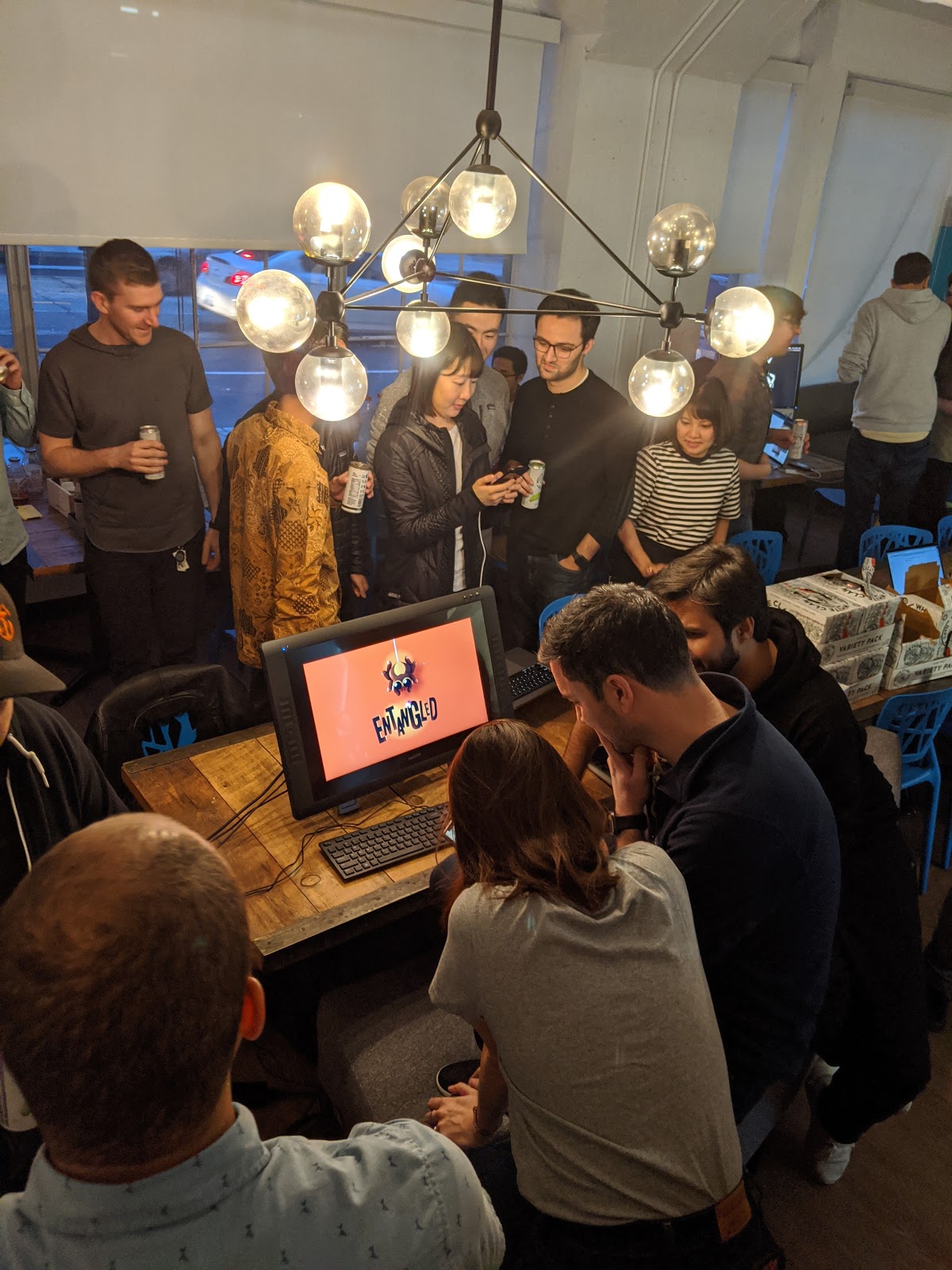 イベントの最後には、参加者が全員集まり、それぞれの試作品をプレイし、もっともクオリティの高い作品を選びました。ゲームをどれくらいプレイしたいと思うか、テーマ、コアのゲームプレイ、全体的なビジュアル、ゲームの作品面の評価を個人がそれぞれ行いました。スコア集計結果は、クモが主役の迷路スタイルのゲーム『Entangled』が作品の評価で最高得点を、『Corgi Space Rescue』が特別賞をとりました。