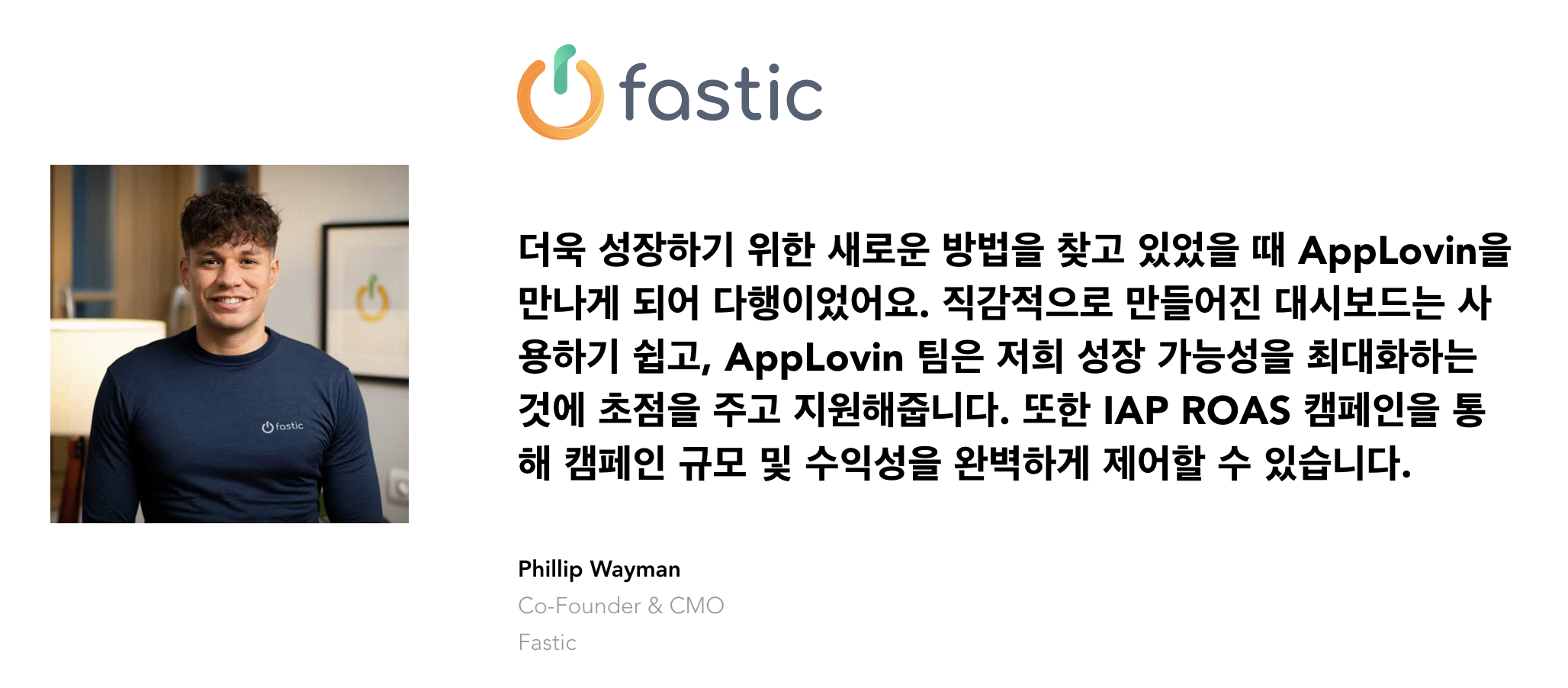 Fastic의 성장 스토리는 가장 최근에 나온 Adweek (영어 기사)에서도 자세한 내용을 보실 수 있으며, 당사의 웹사이트에 있는 성공 사례 코너에서도 AppLovin의 서포트를 통해 어떤 식으로 비즈니스 규모의 확대를 실현했는지 확인하실 수 있습니다.